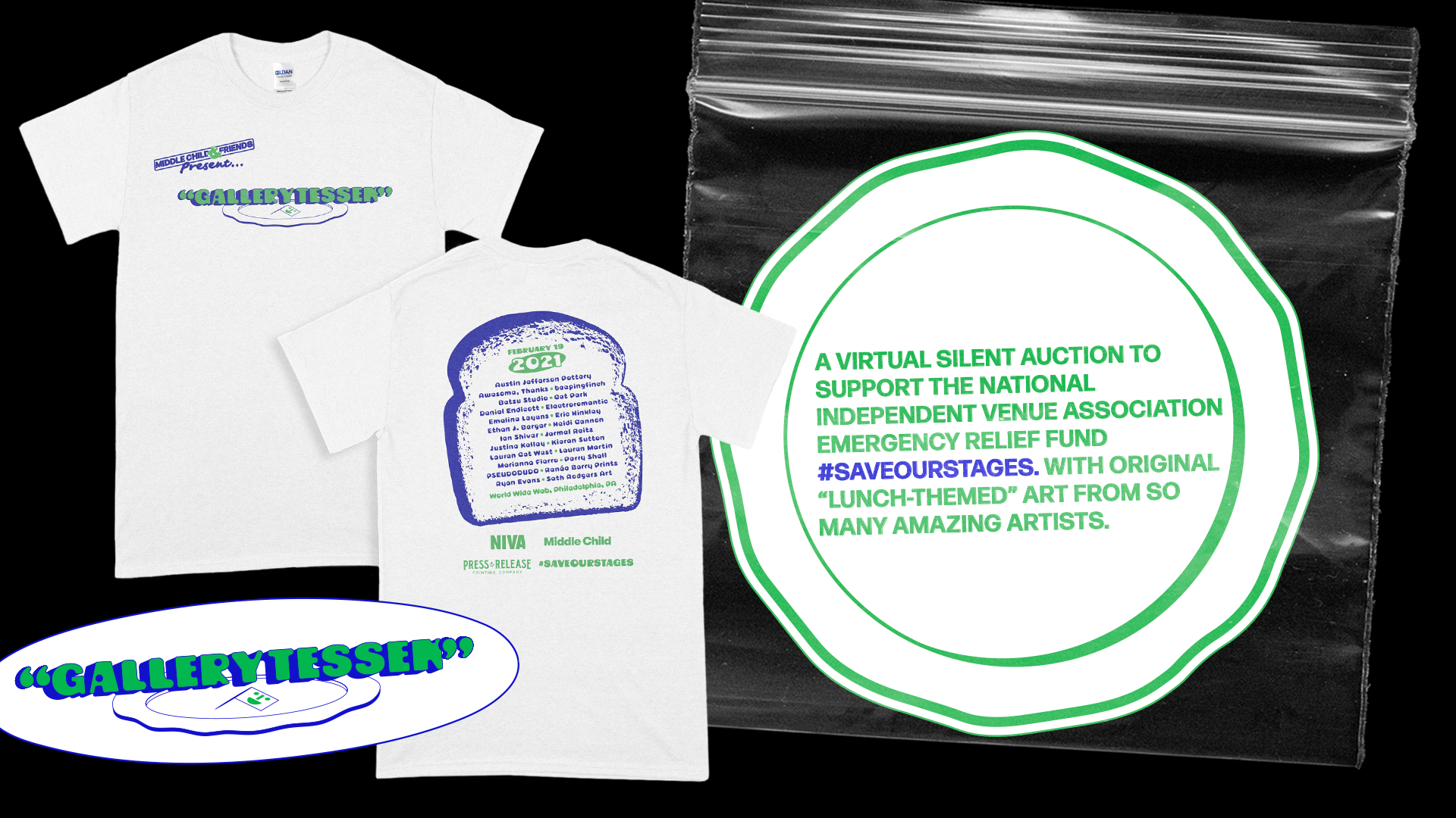 Identity design, logo design and t-shirt for Gallerytessen 2021, a food themed art auction put on by Middle Child Philadelphia. Read about it here.